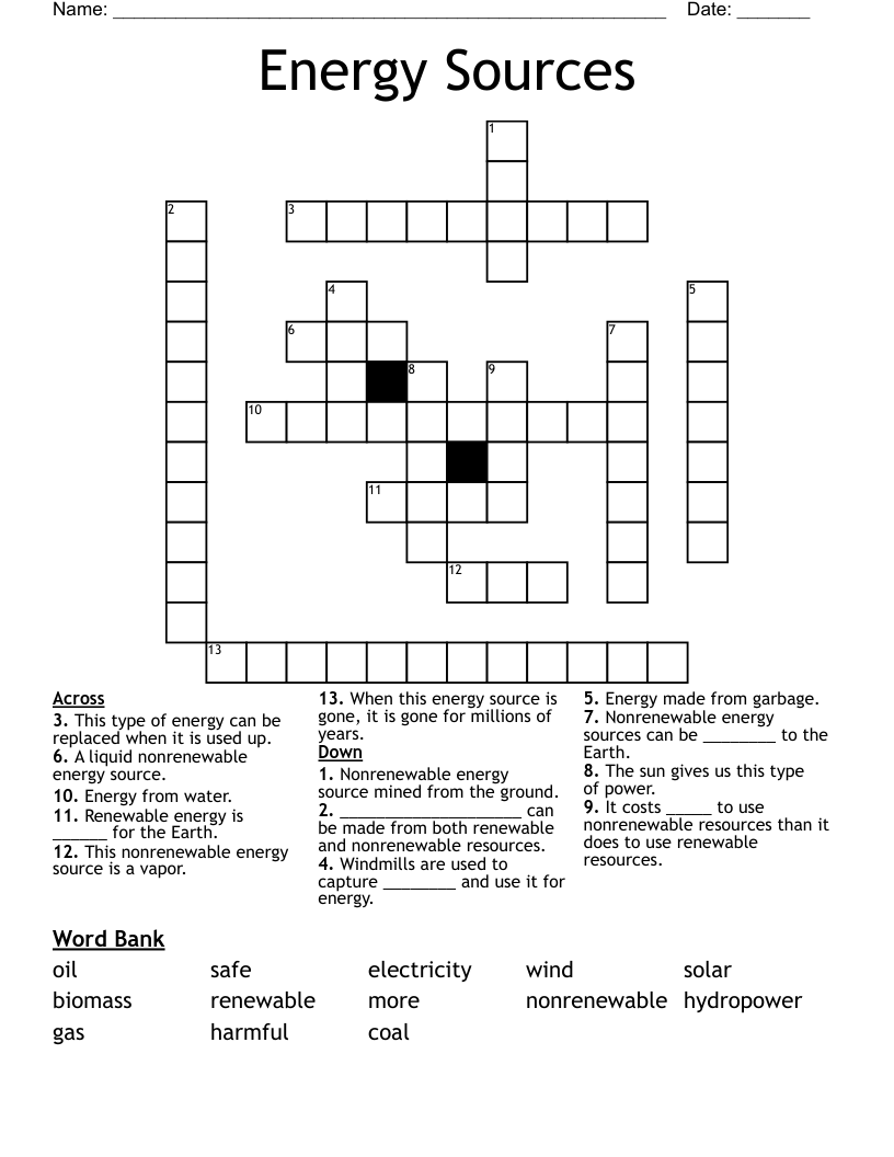 Renewable Energy Crossword Puzzle Worksheet Activity Teaching Resources